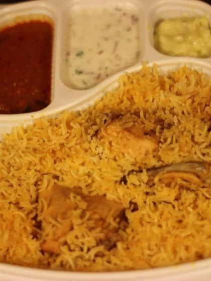 - Accompaniments: Onion Raita and spicy Brinjal/Mirchi Salan.