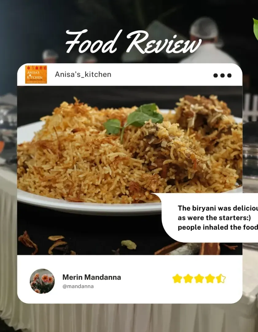 This is the first thing you'll see on my page. It’s a glimpse into the heart of Anisa's Kitchen, showcasing our most loved dishes, our traditional cooking style, and the joy we bring to your celebrations. Each photo represents a piece of our story, from the firewood biryani that started it all to the happy faces of families we've served for decades.