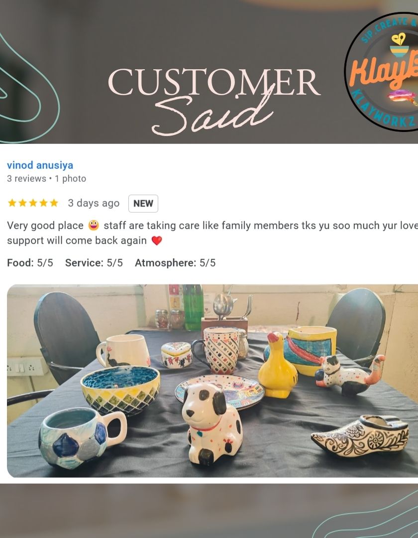 This is the first thing you'll see on my page. I've selected these visuals to give you a quick and vibrant snapshot of the creative, delicious, and joyful experiences waiting for you at my cafe. From getting your hands messy with clay to painting your own masterpiece, this is what KlayBar is all about.
