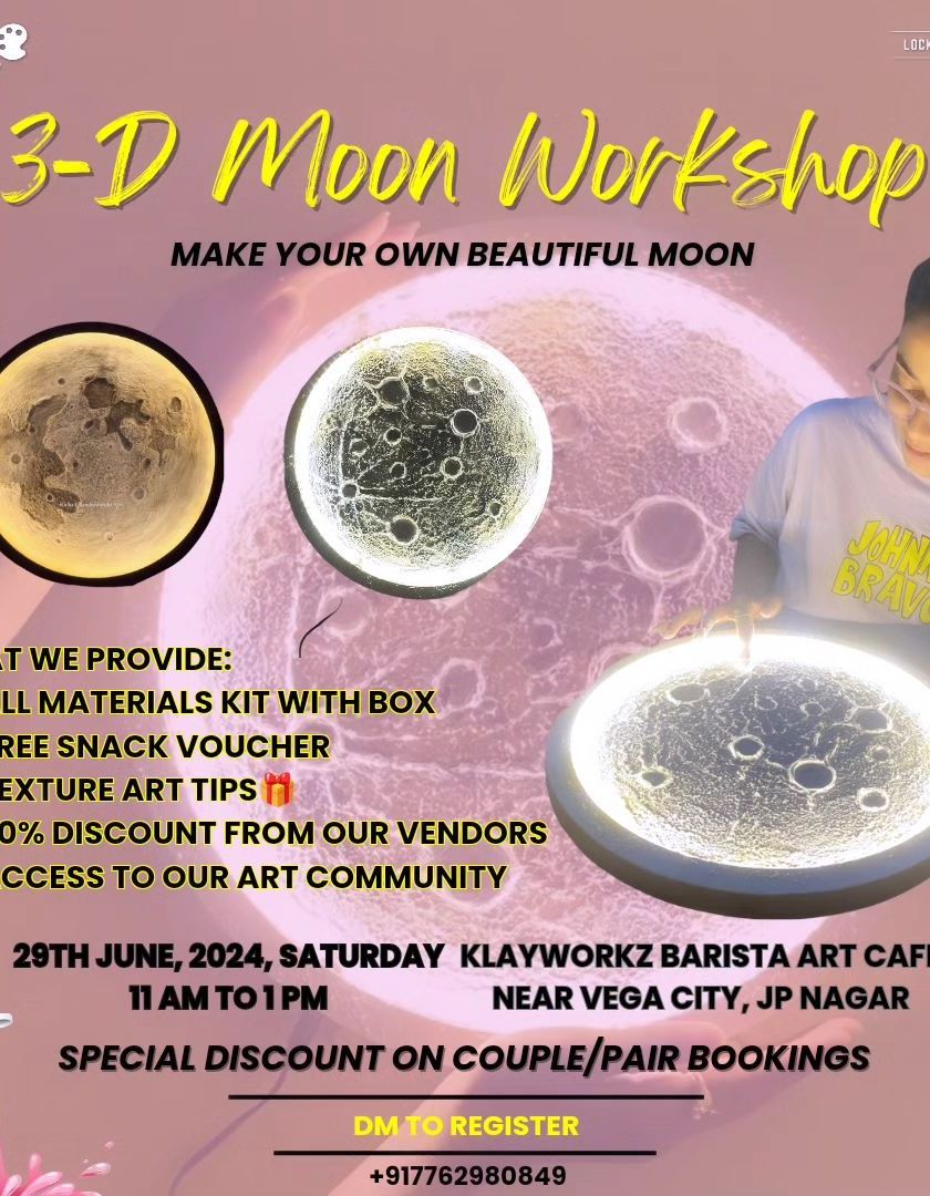 I love keeping things fresh, so I regularly host a variety of special workshops and events. From 3D moon lamp making and resin art to block printing and collaborative painting sessions, there's always a new skill to learn or a unique event to join.