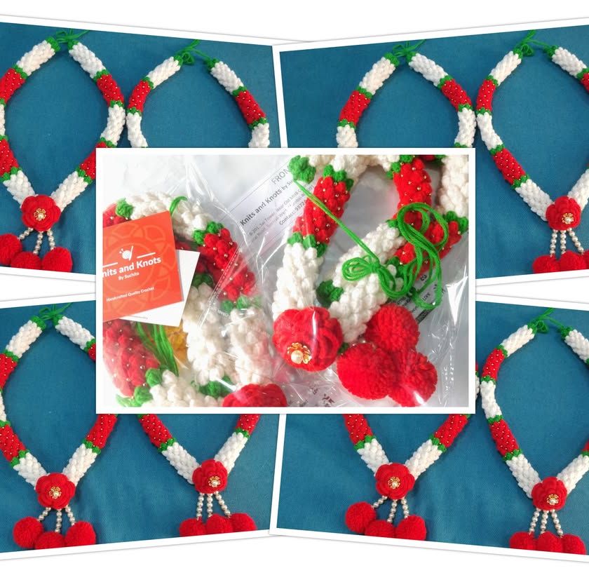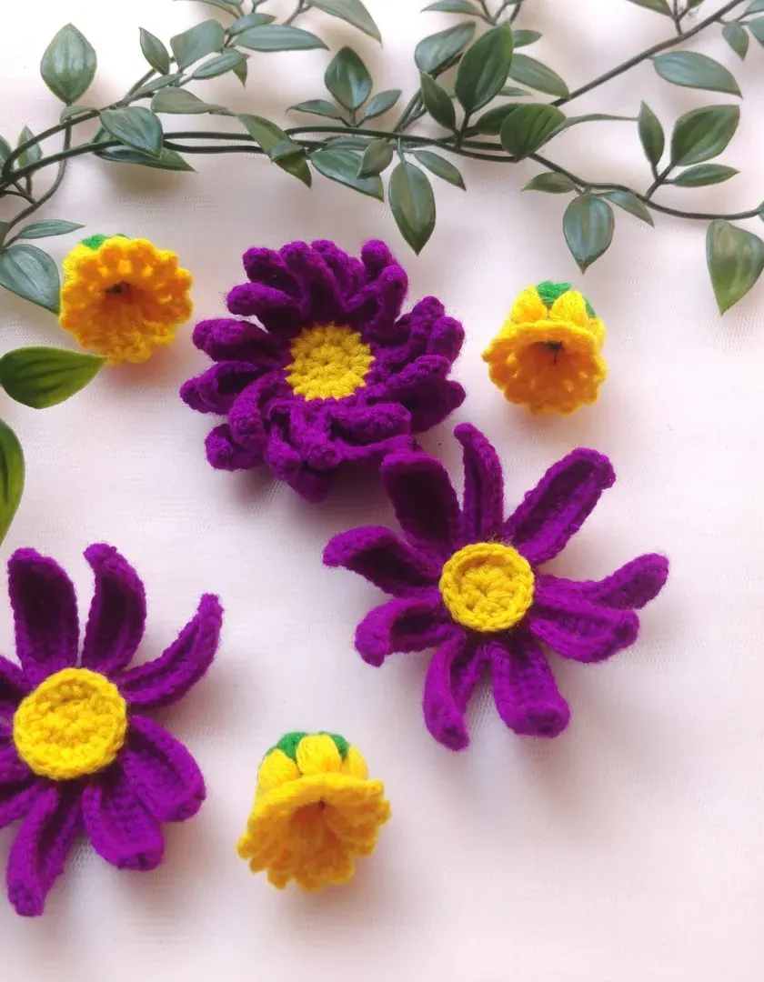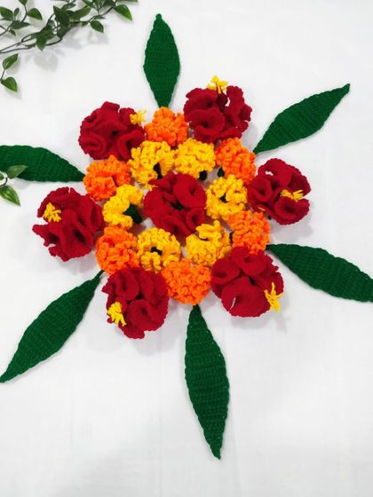 My handmade crochet flowers are perfect for creating your own decorations. This collection includes marigolds (zendu), hibiscus (jaswand), and other floral designs that you can use for rangoli, pooja thalis, or other festive arrangements.
