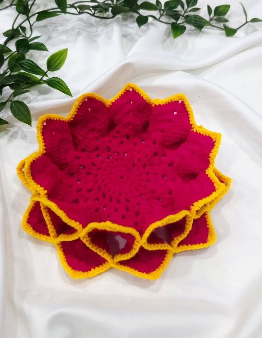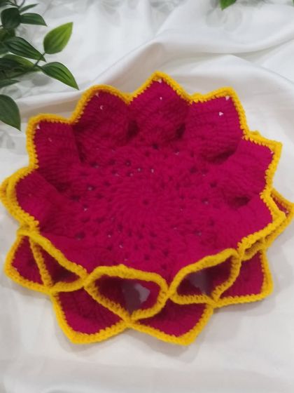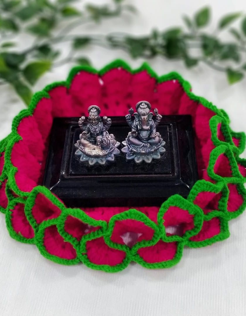 Perfect for your mandir, as a base for idols and diyas, or as festive coasters. Each kamal aasan is made with durable, washable yarn and is available in various colors, making them a popular choice for return gifts.