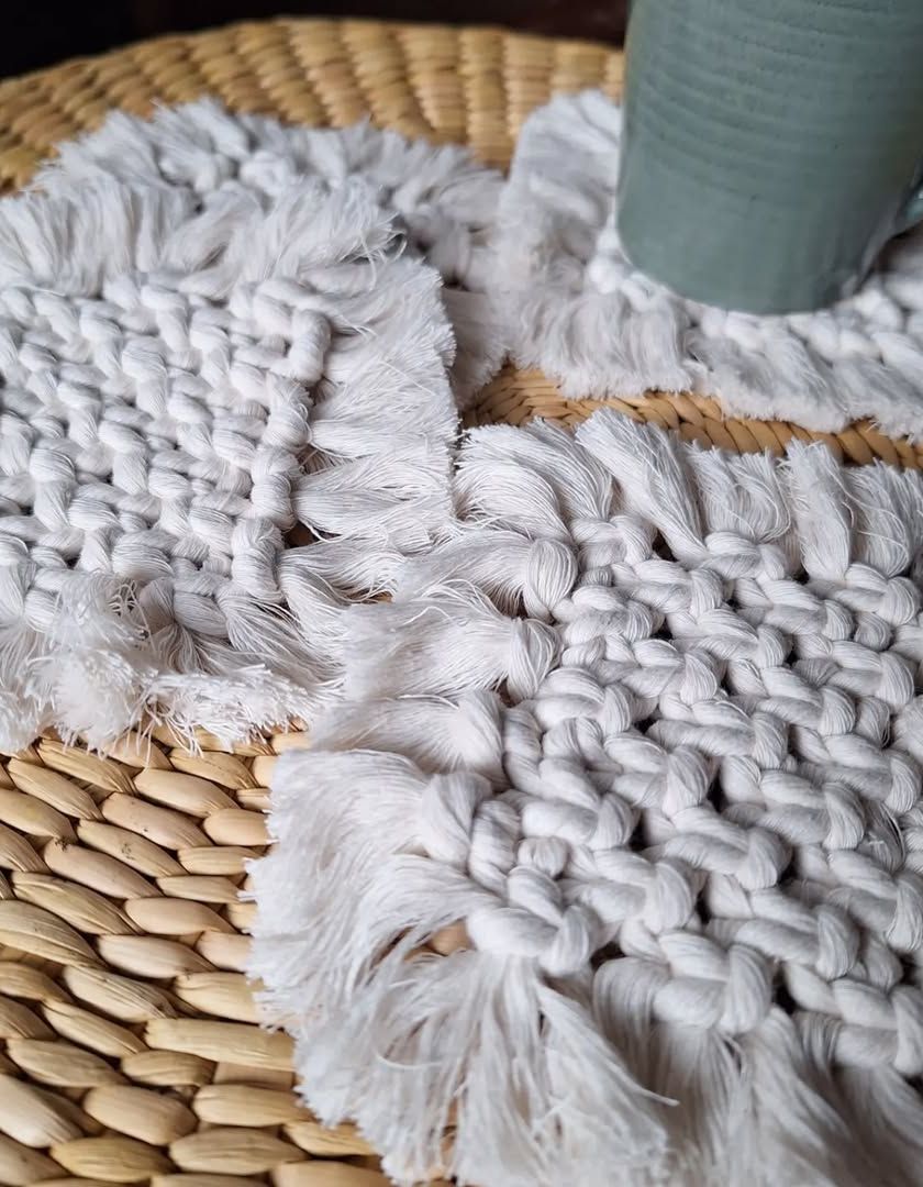 Perfect for your daily chai or coffee ritual, these handmade coasters protect your surfaces with a bit of handmade charm. I create them in different styles, from minimalist woven designs to spiraled patterns with soft fringes.