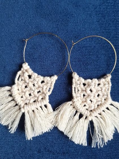 - Macrame Hoops: Metal hoops wrapped in knotted cotton with sun ray fringe or twisted rope textures.