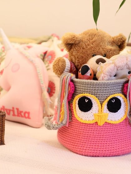 My sturdy crochet baskets are a cheerful way to tidy up toys, books, or extra pillows. Discover the popular Owlie Basket, bold Frida-inspired designs, and other colorful options to help organize your child's space with a handmade touch.