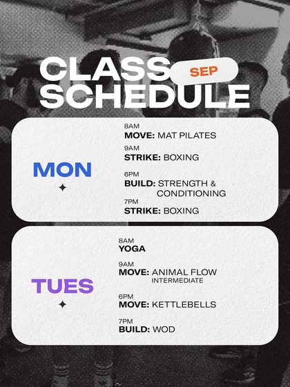 - Variety: Choice of one specialized format per booking: STRIKE (Boxing), BUILD (S&C), MOVE (Animal Flow/Mobility), HIIT, or Mat Pilates.