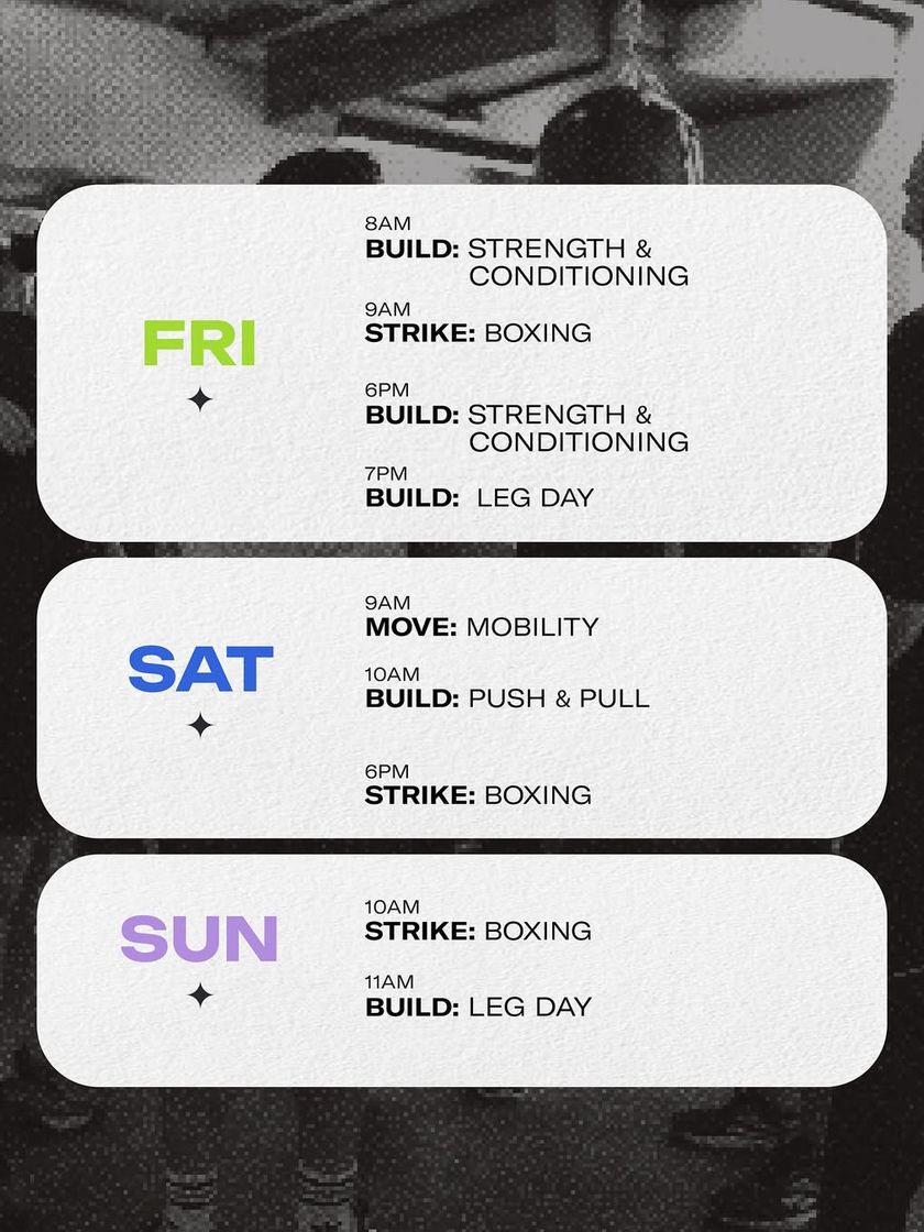 Here is a sample of our weekly class schedules for The Lab*. Our programming is always changing to keep things fresh and challenging, but you can always expect a mix of BUILD (Strength), STRIKE (Boxing), and MOVE (Mobility/Flow) classes.