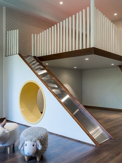 - Bespoke curved joinery and concealed doors integrated into wall paneling.