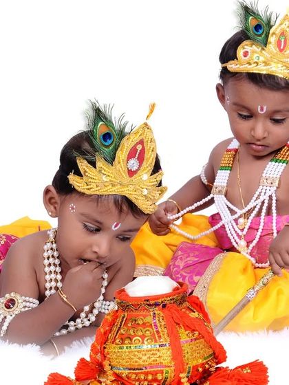 I specialize in thematic photoshoots for Janmashtami, providing all the costumes, props, and custom backdrops. We can create beautiful portraits of your children as Krishna or Radha, or capture the classic Yashoda Krishna theme with mother and child.