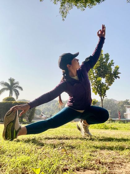 Hey, I’m Komal – 17 years in Gurgaon, running this studio that’s more than just yoga mats and poses. My journey kicked off with ‘Om Gan Ganpataye Namaha’ and that’s still my anchor, my ‘antargyan’ (inner wisdom). Dad taught me to show up, pind di zameen (village roots) taught me to stay grounded. Sometimes I’m in a field with my sister, sometimes skydiving in Dubai – it’s all gratitude and living free, inside and out.