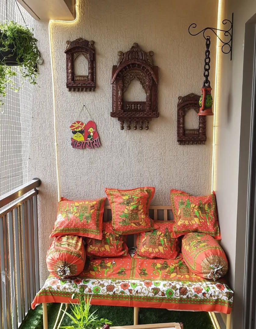 Want a balcony with a unique personality? I specialize in creating themed spaces, like this vibrant Rajasthani-inspired corner, using authentic textiles, furniture, and decor pieces.