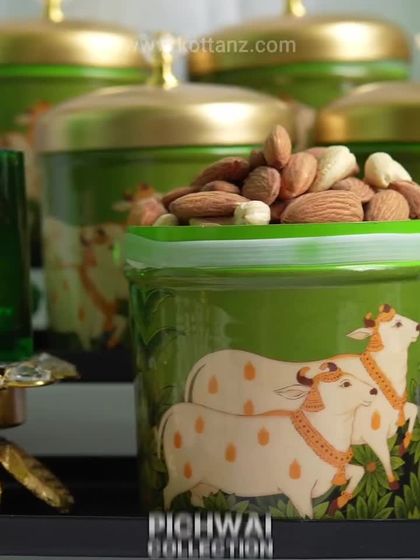 We celebrate the rich tapestry of Indian folk art with this special collection. It features the beloved Pichwai cow, elegant lotuses, and vibrant parrots on a range of items, from trunks and trays to potlis and jars, all designed to be a piece of art to cherish.