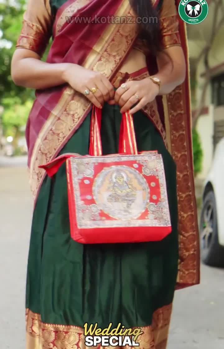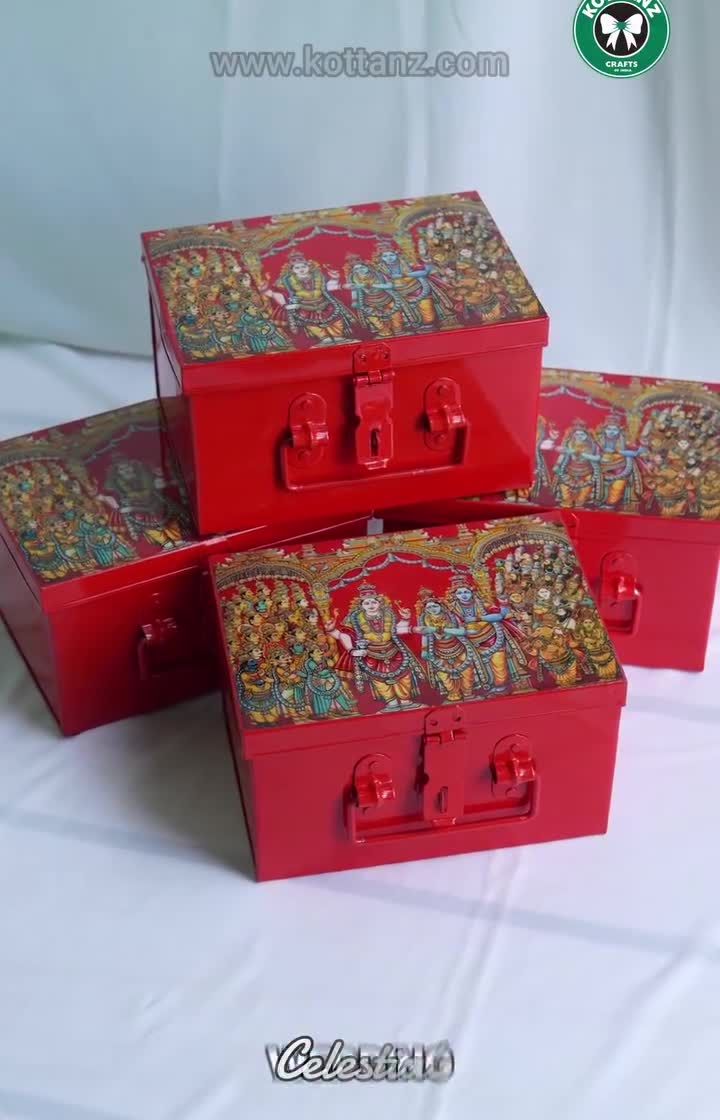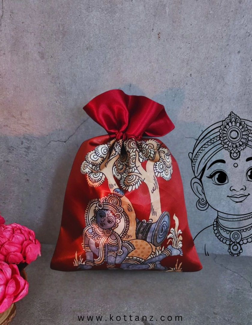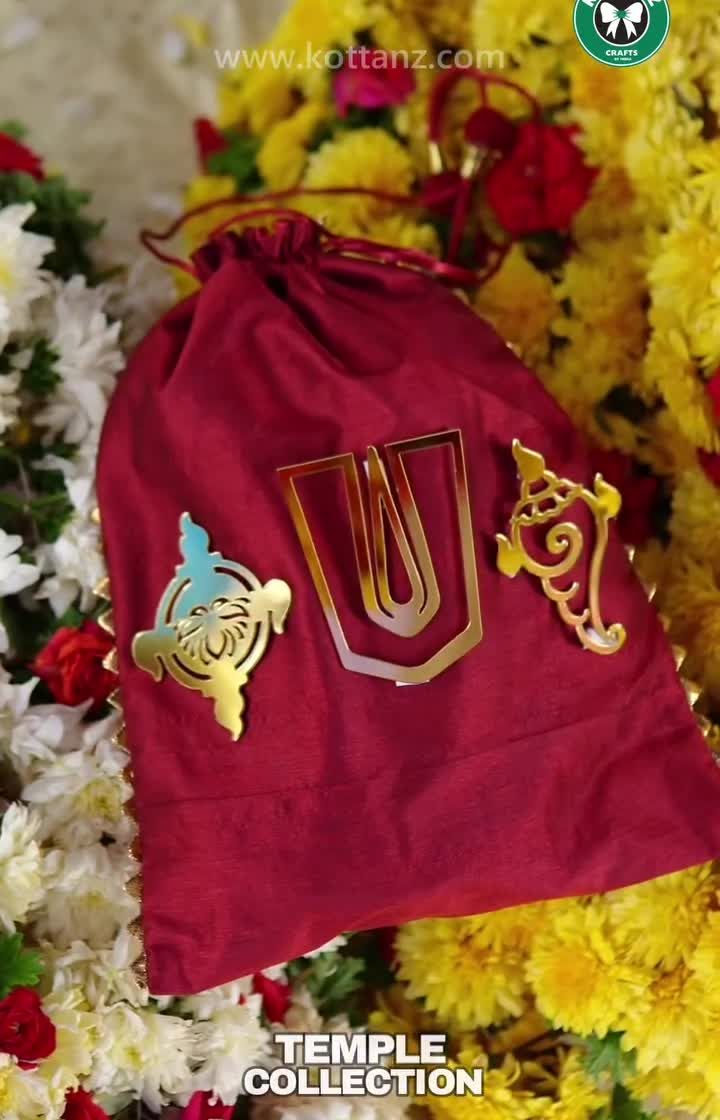 Inspired by the divine art and motifs of South Indian temples, this collection is perfect for auspicious occasions. It features items with Sanku, Chakra, and Namam symbols, as well as Tirupati and other temple-themed designs on bags, boxes, and souvenirs.
