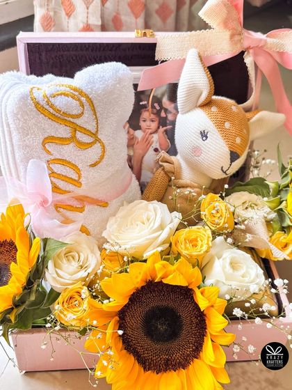 The arrival of a baby is magic! I make creative hampers for announcing the news or gifting new parents. From glittery boxes with neon ribbons to personalized scrolls like ‘Le Bébé Times’, I love mixing things up. Whether it’s for baby showers, godh bharai, or just surprising your parents, I’ll help you make it special with unique baby announcement gifts.