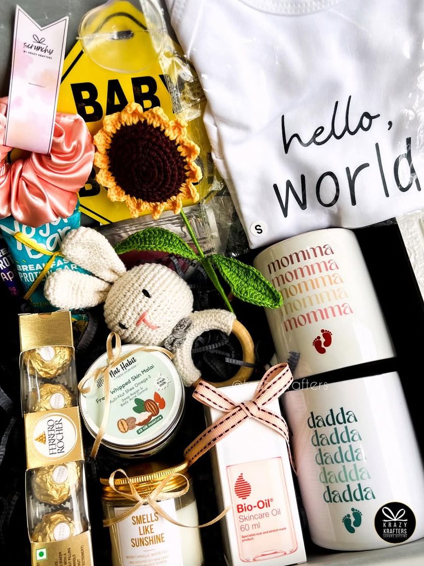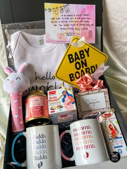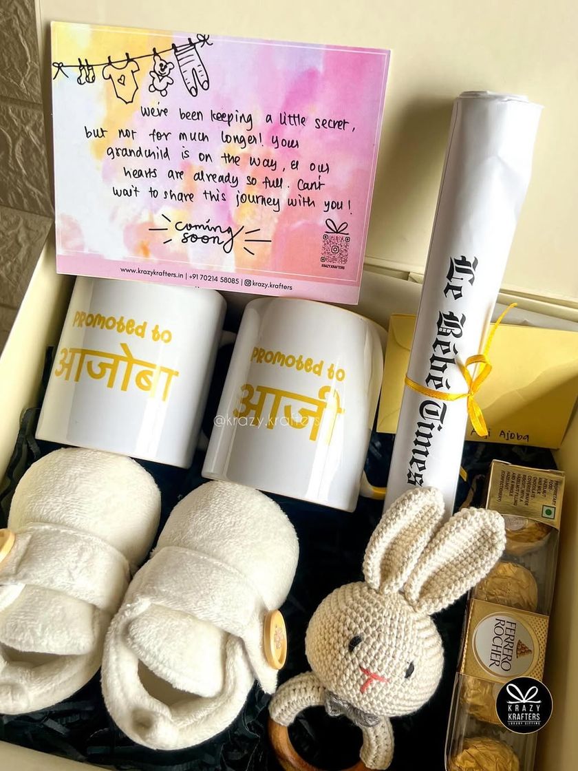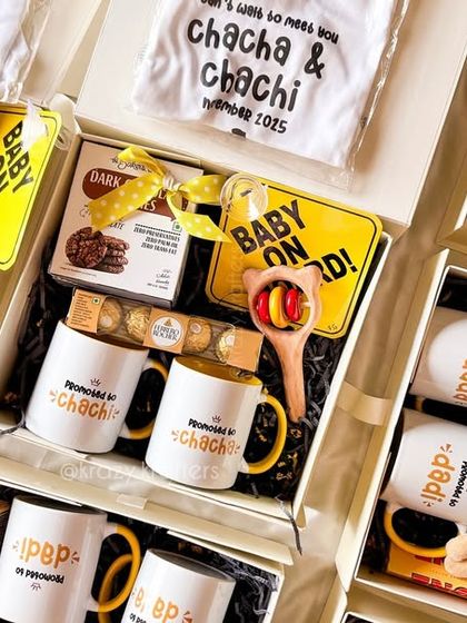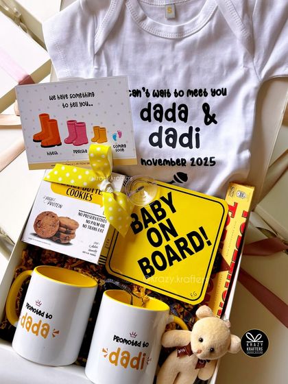 Share your big news in the most memorable way. We create personalized pregnancy reveal hampers for grandparents, aunts, uncles, and the whole family, featuring custom onesies, mugs, and creative announcement cards.