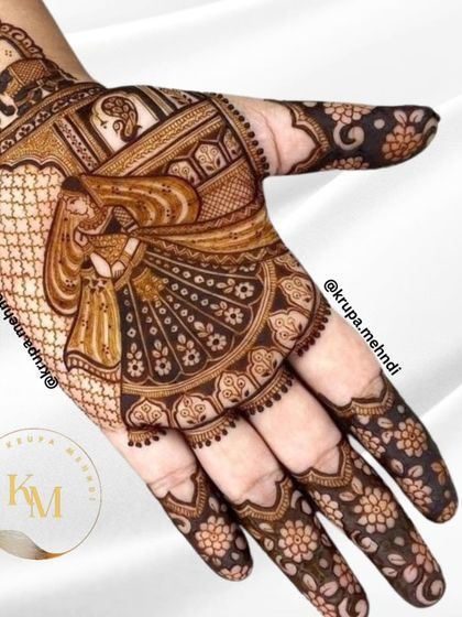 This is for the bride who dreams of being a queen. I create full, intricate designs featuring traditional motifs like raja-rani portraits, elephants, palaces, and dhol-shehnai to tell your royal wedding story from your hands to your feet.
