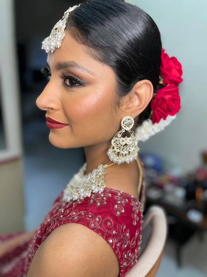 I don’t dictate - we collaborate. I help design your look for each ceremony, whether you want dewy skin bridal makeup, classic bold lips, or a traditional South Indian bridal braid (poola jada). If you’ve got a big bridal party, my team’s got your back for bridal party hair styling and makeup.