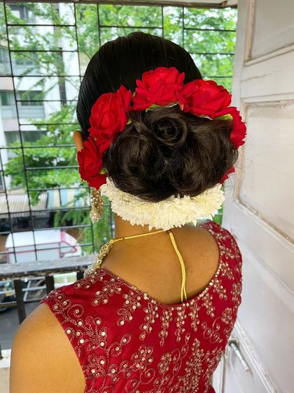 From Haldi’s fresh vibes (with real flowers, yaa!), to Sangeet glam, to wedding and reception updos or floral braids - I mix classic, modern, and cultural styles. Accessories? I love adding gajra, veils, tiaras, you name it.