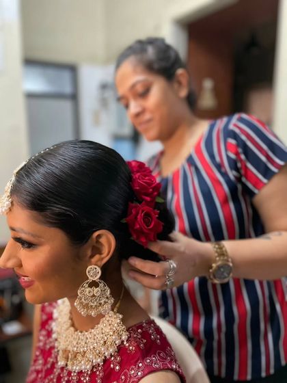 Your hair is the frame for your beautiful face, and I love creating hairstyles that are a work of art. This gallery showcases a variety of styles, including intricate floral updos, traditional braids like the poola jada, and soft, romantic waves. We can incorporate any accessory, from fresh gajra and flowers to elegant hairpieces.