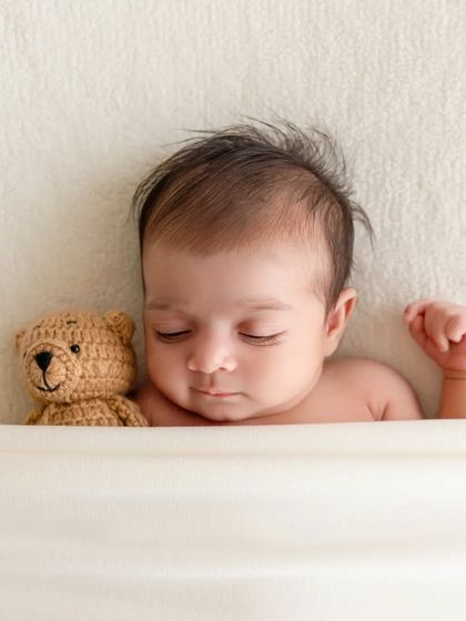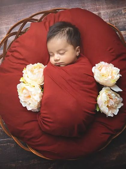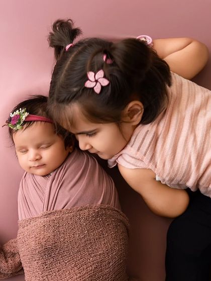 I do newborn and baby photoshoots with safe posing, styled setups, all props provided, and family can join in for portraits.