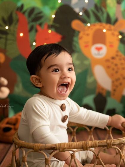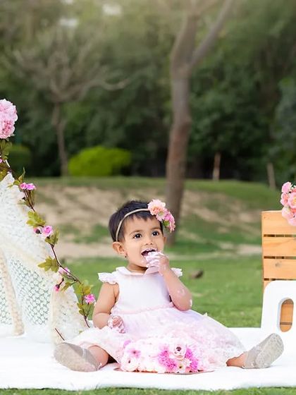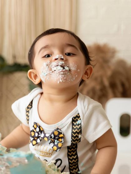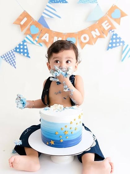 - Once your baby is comfortable, it’s time for the cake smash. I pick a cake that fits our theme. This part’s always unpredictable - some babies dive in, some poke at it, but either way, I keep snapping those honest reactions.