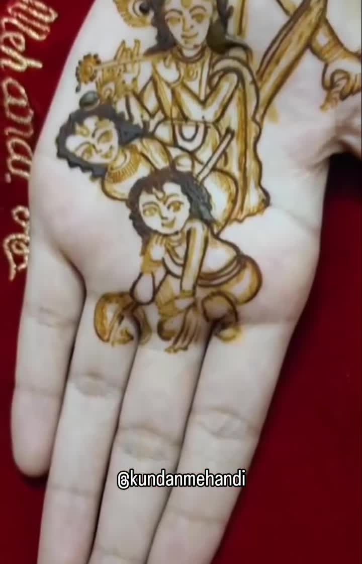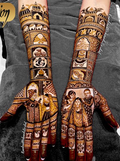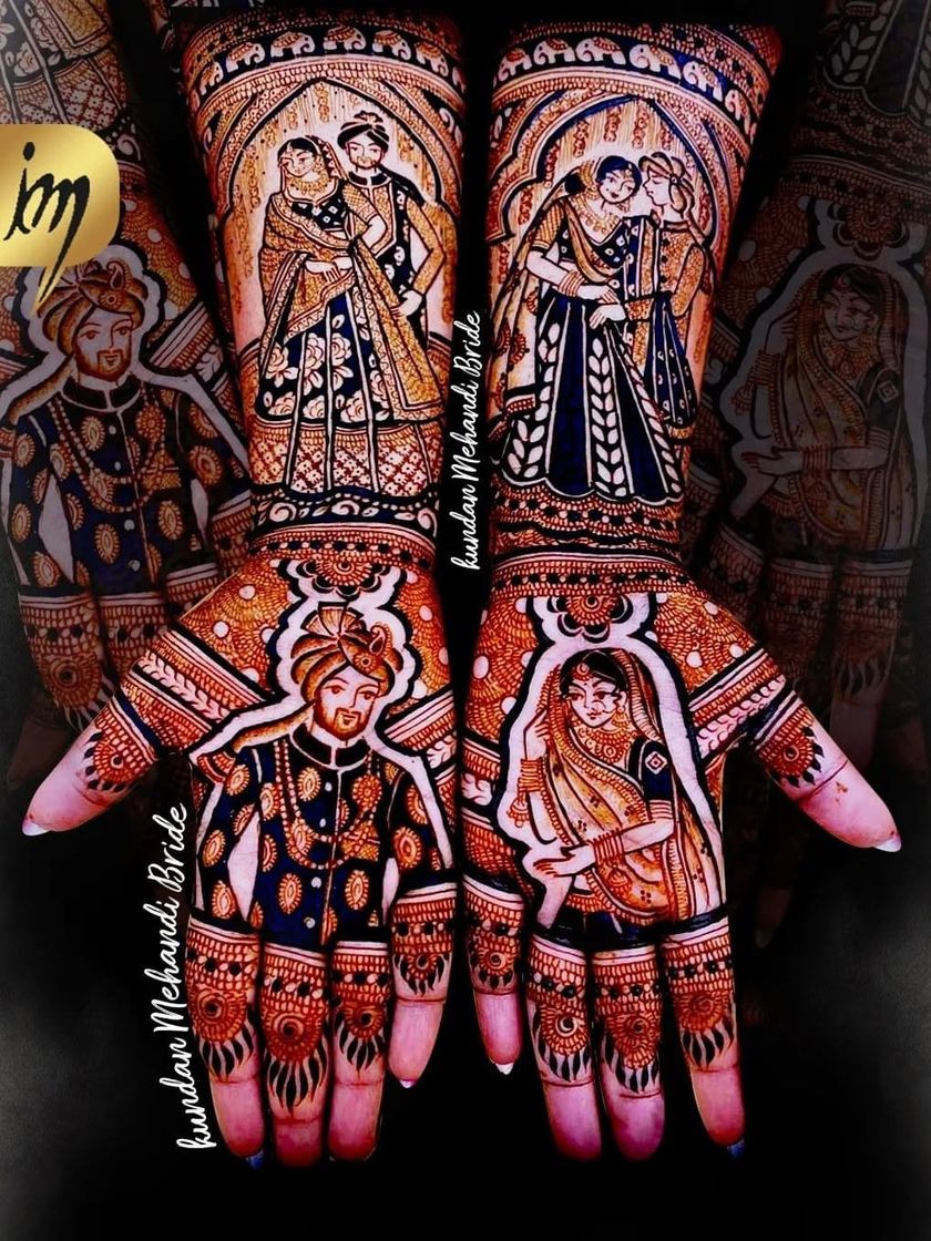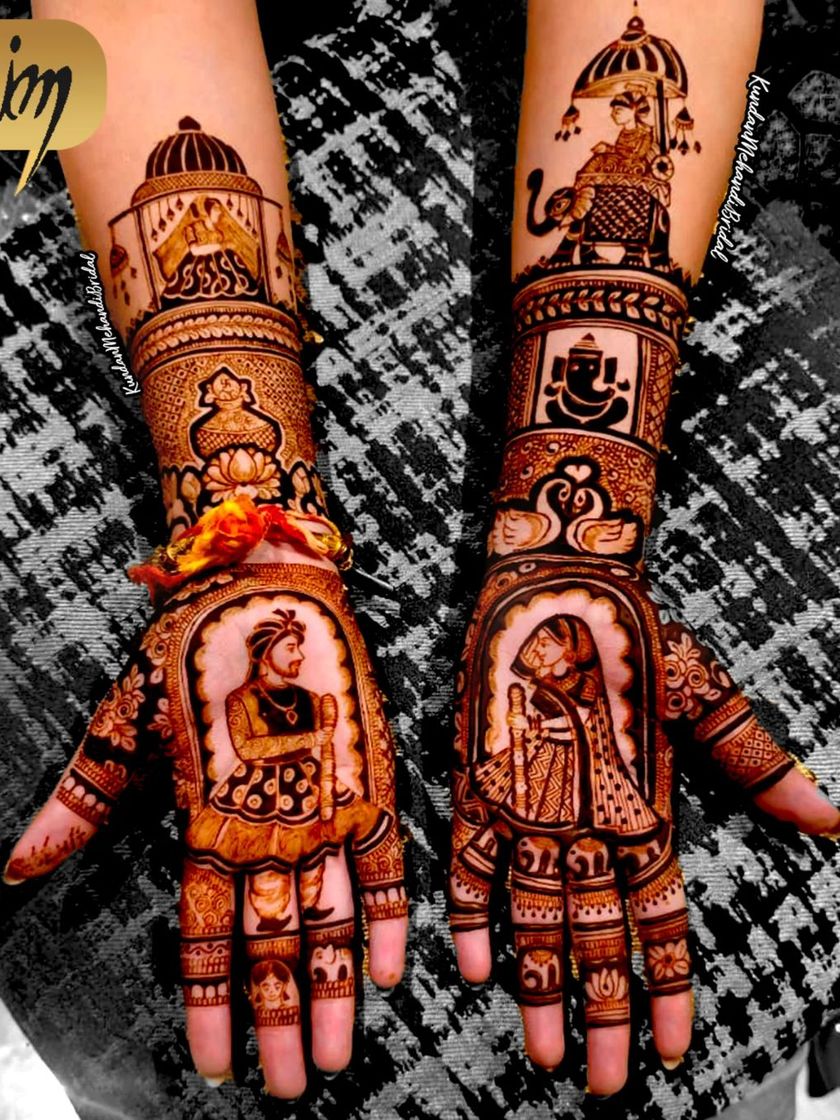 Your wedding mehndi should tell your story. I specialize in creating detailed portraits of the bride and groom, recreating wedding scenes like the varmala or kanyadaan, and even hiding your wedding hashtag or special dates within the design. I can also draw religious figures like Radha-Krishna or Shiv-Parvati for blessings.