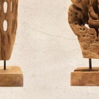 - Abstract forms with driftwood-inspired shapes and carvings, these handcrafted teak sculptures always get noticed.