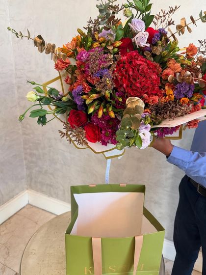 Each arrangement is custom-made. My signature 'Bouquet in a Bag' is a hit - a bold bouquet in our green tote, perfect for gifting. I also make custom floral hampers, packing exotic flower arrangements with fresh fruits in rustic crates - fab for wellness gifts or trousseau.