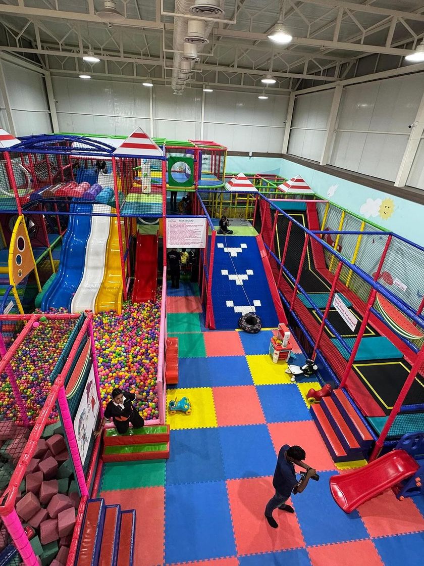 I made sure our littlest guests have a safe and stimulating space all to themselves. This area is filled with age-appropriate ride-on toys, a soft merry-go-round, and gentle play structures, all within a padded and enclosed section.