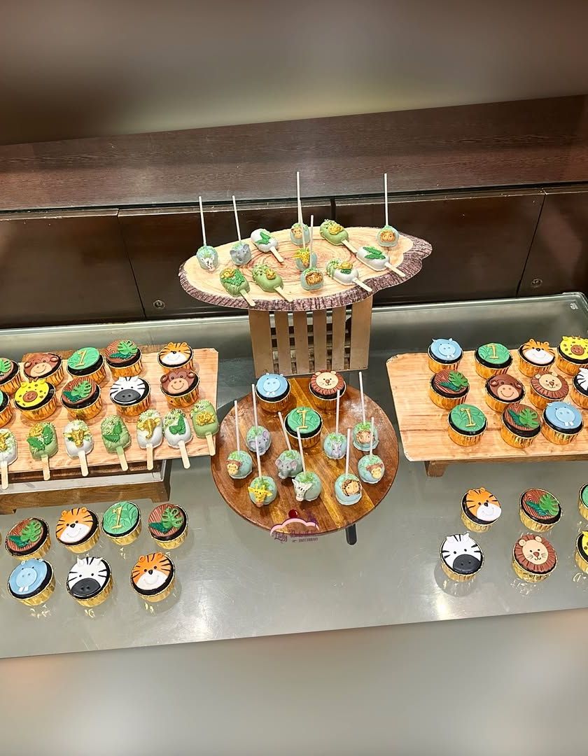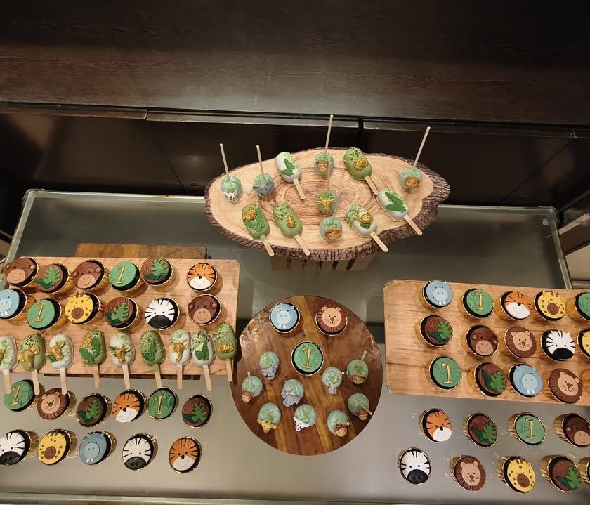 I create complete dessert experiences for your little one's 'Wild One' birthday. This popular setup includes a showstopper cake, plus matching themed cupcakes, cakesicles, and cake pops with adorable, handcrafted fondant animals.