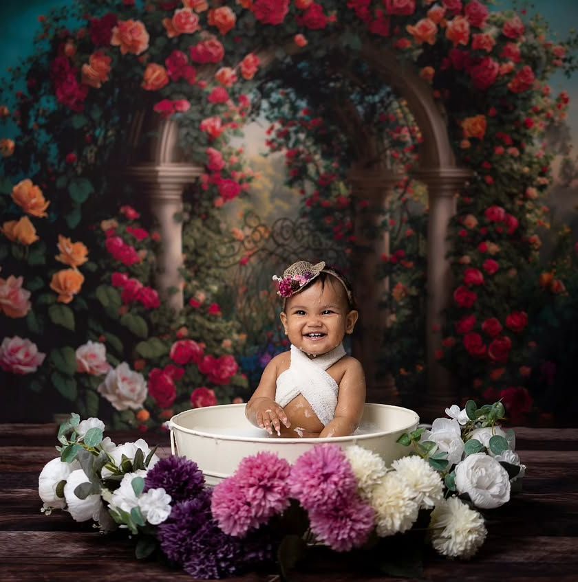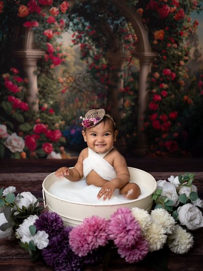 The sitter milestone, around 6 to 9 months, is perfect for capturing your baby's budding personality. I offer simple, elegant setups with neutral tones or fun themes like this floral milk bath session for some splashy smiles.
