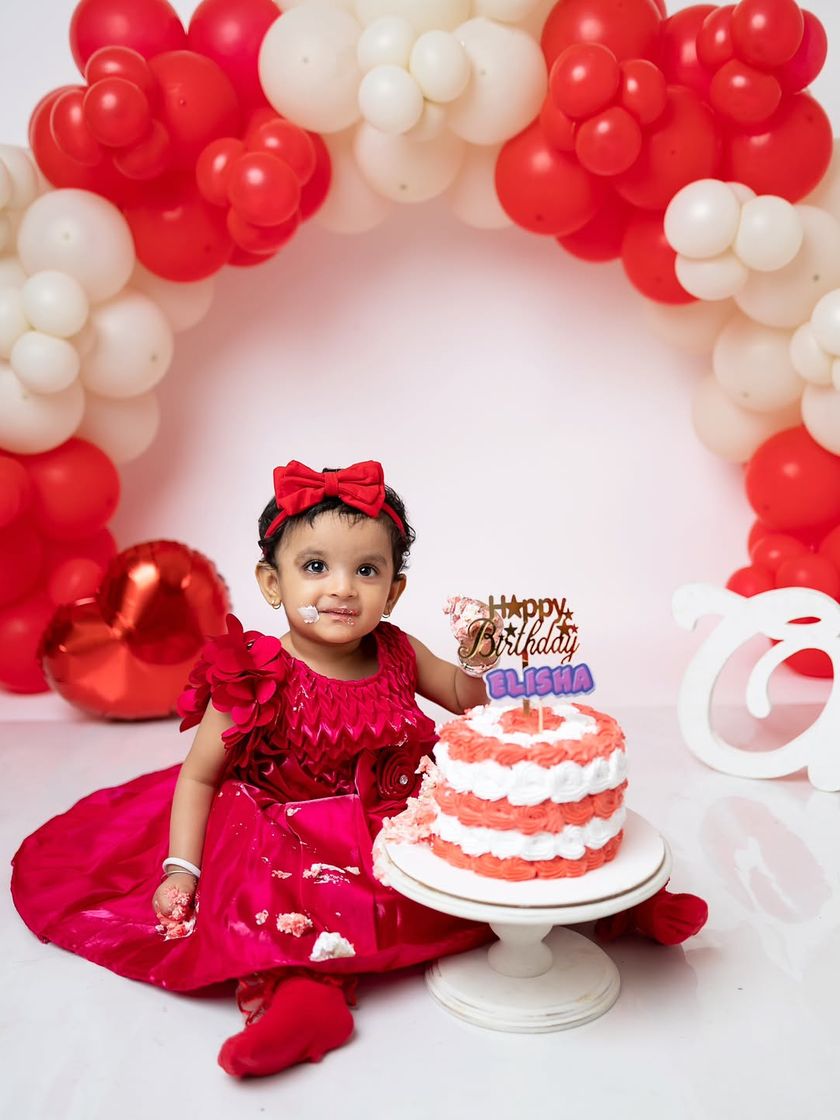 Let's celebrate your baby's first birthday with a fun and messy cake smash session. I offer various themes and color schemes, like this classic red and white setup or a soft pastel palette, complete with balloons, props, and the cake stand.