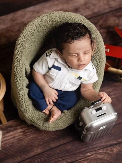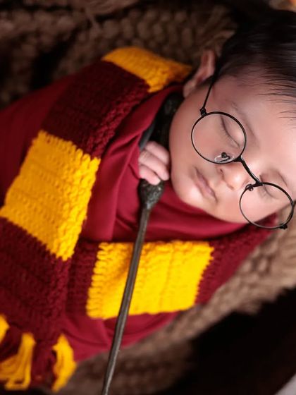Bringing our Maharashtrian roots into the studio is my favourite part. From 'Har Har Mahadev' baby shoots (mini Lord Shankar, trishul, damaru) to 'Rajmata Jijabai' saree wraps and Warkari looks, I’ve got loads of local themed props. If you’re after something quirky, how about a Harry Potter setup or a tiny pilot with a globe? There’s a whole stash of creative baby photo props in my studio.