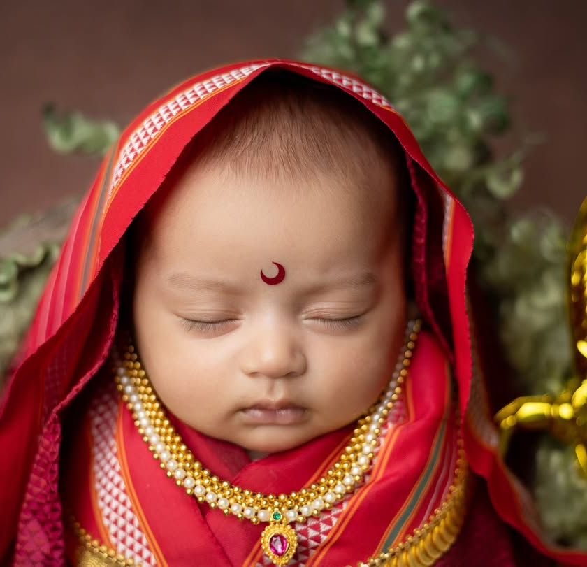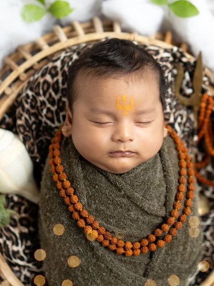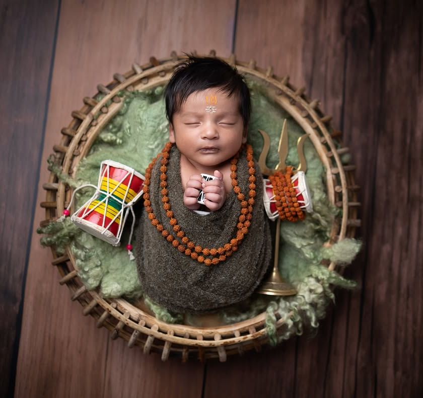 This is a powerful and popular theme, portraying the newborn as a divine form of Lord Shankar. I use baby-safe props like a miniature trishul, damaru, and soft rudraksha beads to create a respectful and adorable tribute that families cherish.
