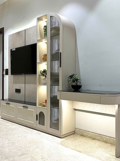 - Living rooms: Plush sofas, L-shaped sectionals, TV units with hidden study nooks, floating consoles with backlighting.
