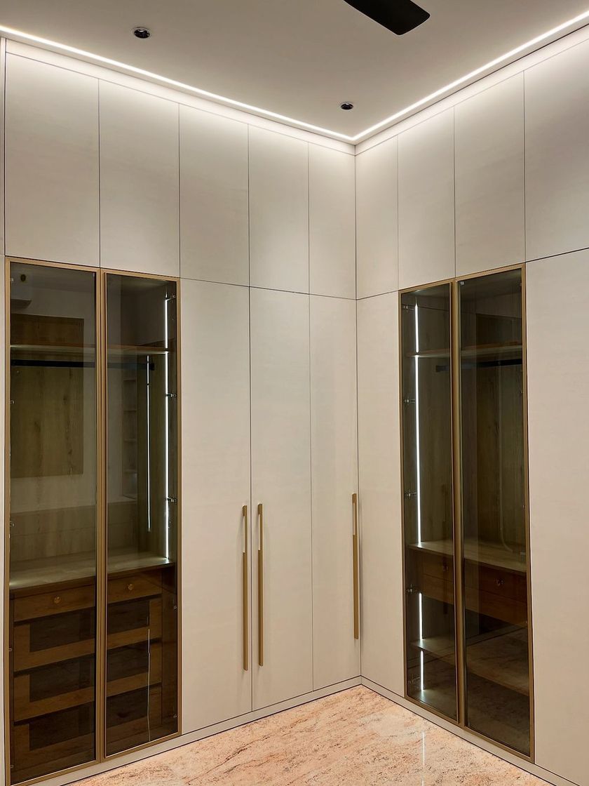 We design and build luxurious walk-in wardrobes that organize your life with style. Our solutions include floor-to-ceiling storage, island dressers with glass tops, and dedicated sections for accessories, all finished with premium materials.