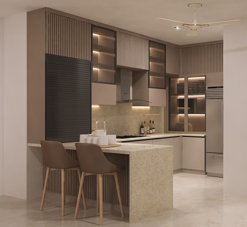 This design combines different textures, including vertical fluted panels and smooth matte surfaces, to create a warm and inviting space. It features a functional breakfast island, integrated appliances, and a mix of open and closed storage solutions.