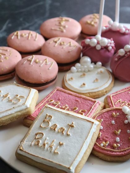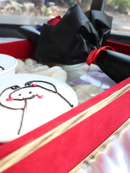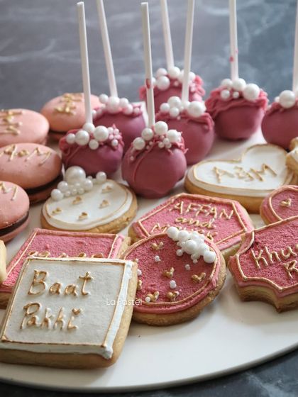 We make custom, eggless treat platters for pre-wedding ceremonies with your colors, names, and themes, ready in 4-5 days.