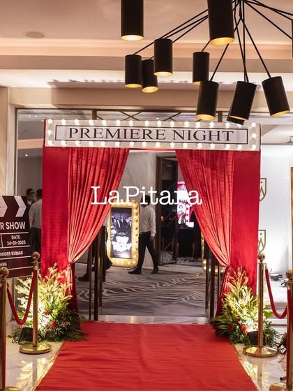 - Grand Entrance: 20ft Red carpet walkway flanked by velvet rope barricades and a themed entrance arch.