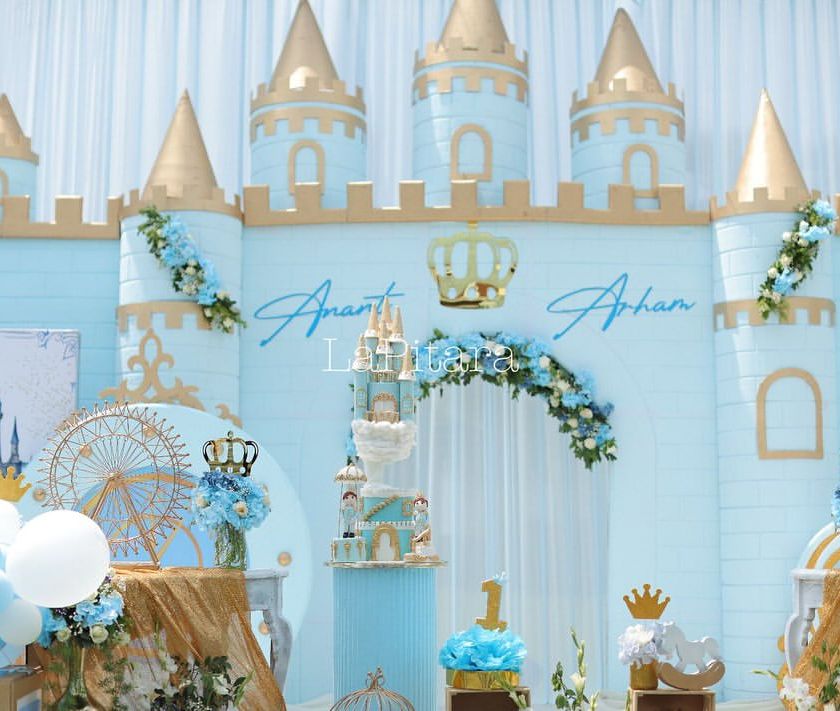 For the little prince or princess in your life, I create storybook celebrations. This collection features grand castle entrances, regal decor in shades of royal blue and gold, and enchanting details like horse-drawn carriages and fairytale backdrops from themes like 'Frozen'.