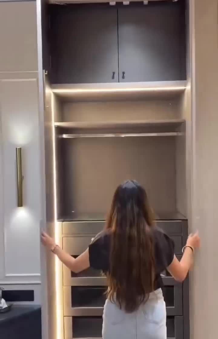 Smart, elegant storage is the key to a functional and clutter-free home. I design bespoke solutions, from luxurious walk-in closets with black glass sliders to clever hidden storage like pull-out tables in TV units. My focus is on maximizing utility without ever compromising on style, using premium finishes and hardware.