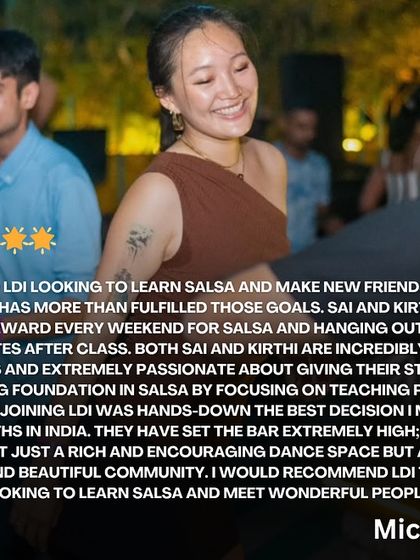 We’re Sai & Kirthi, the chaos and heart behind Latin Dance India. Couple life means drama by default, but hey, it keeps the Salsa spicy. Our students? Total 'dance fam'. We roast, we laugh, we mess up together (Friendship Day Roast gets wild, trust us). For us, it’s about more than steps - it’s finding your people, letting loose, and watching dance flip lives around. That’s our jam.