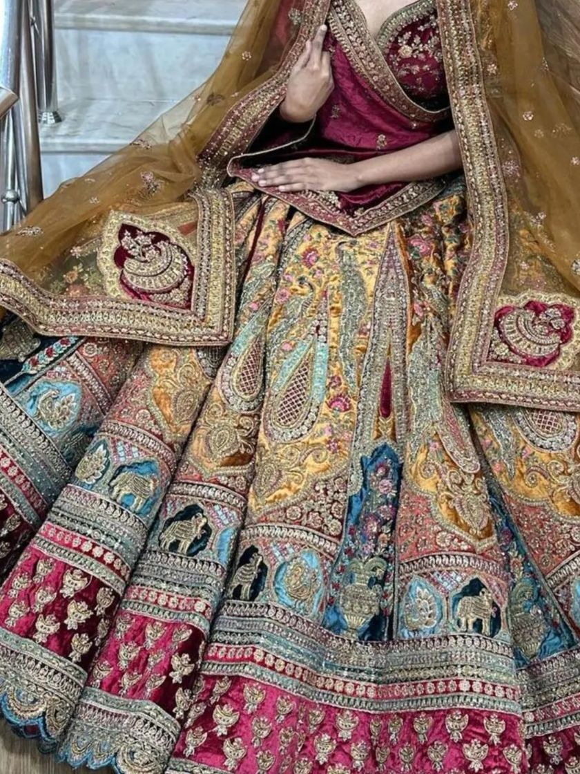 My main collection features traditional bridal lehengas for your wedding day. I have everything from classic deep maroons and reds to rich velvets, all with heavy zari, sequin, and threadwork, and most come with double dupattas for the complete dulhan look.