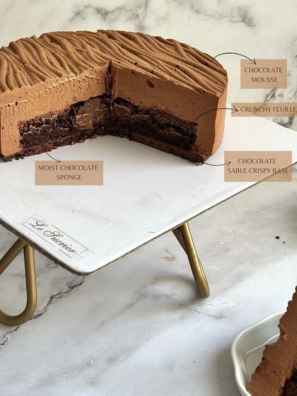 - Entremets: 4-layer construction featuring Chocolate Sable base, moist sponge, crunchy Feuilletine, and Belgian Chocolate Mousse.