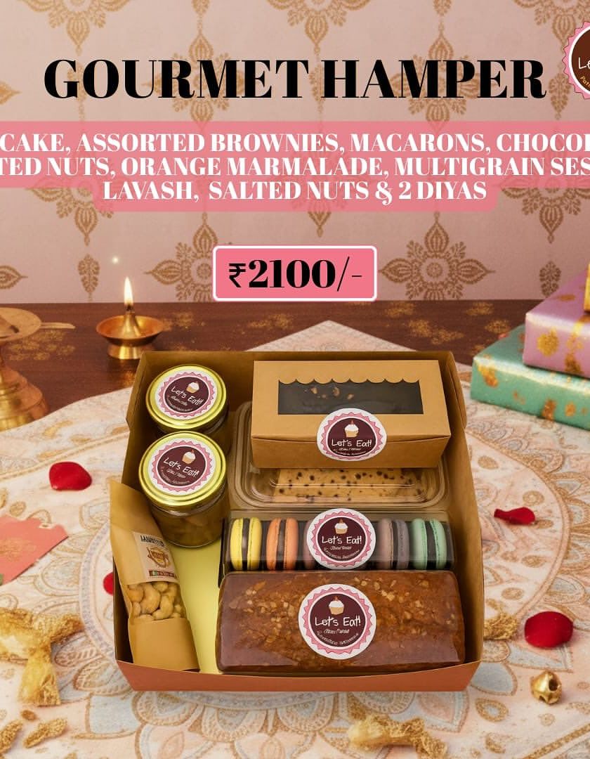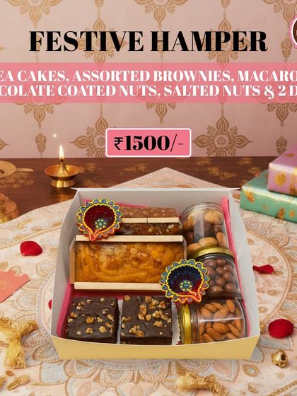 Make your Festival of Lights extra special with my handcrafted Diwali hampers. I offer a wide range of options, from luxurious gourmet boxes filled with tea cakes, brownies, and macarons to smaller, elegant gift sets with assorted goodies and decorative diyas, all customizable for personal or corporate gifting.