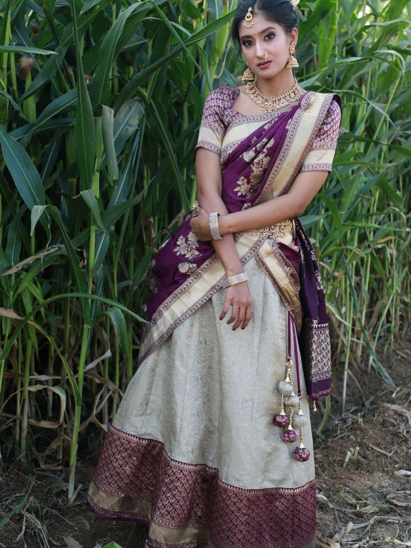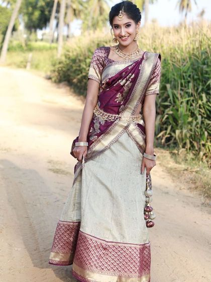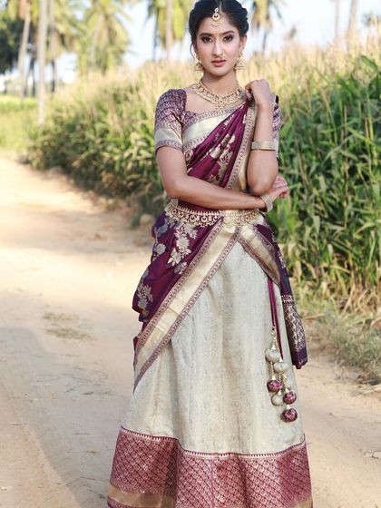 Find the perfect traditional South Indian look with my Langa Voni rentals. I have various designs available, from classic silk combinations like purple and cream to vibrant blue and aqua sets for any festive occasion.