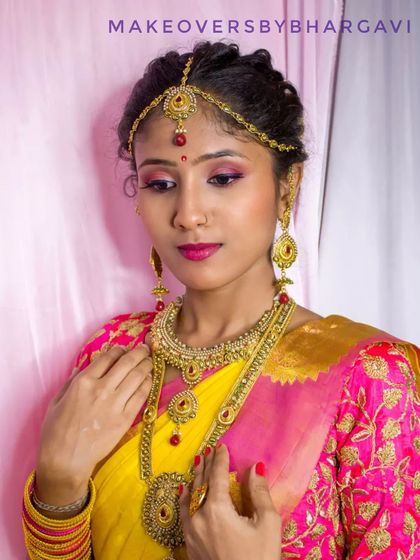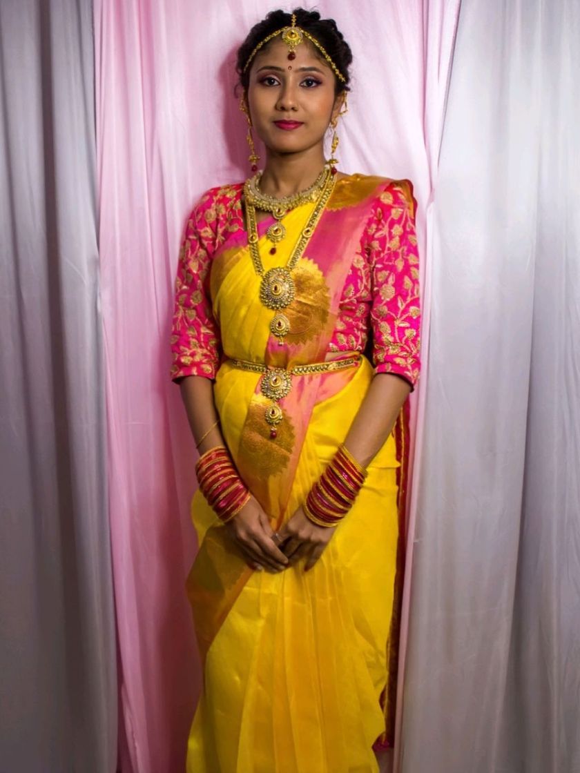 I also offer timeless silk sarees for rent, ideal for pujas, small ceremonies, or traditional events. This yellow and pink saree comes as a complete set with a designer blouse for a coordinated look.