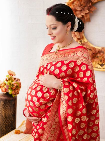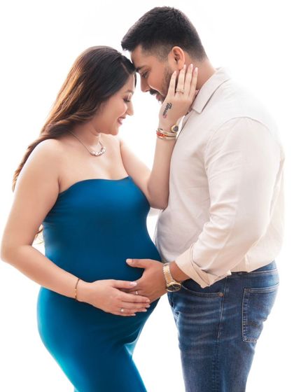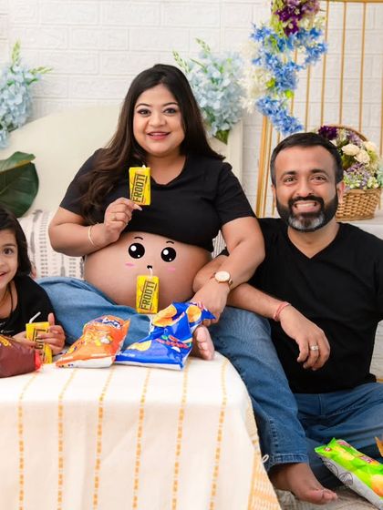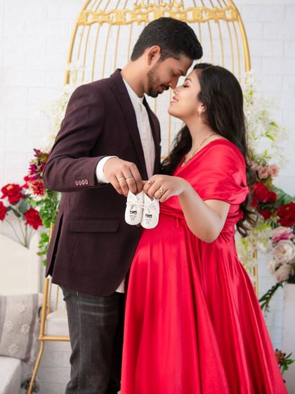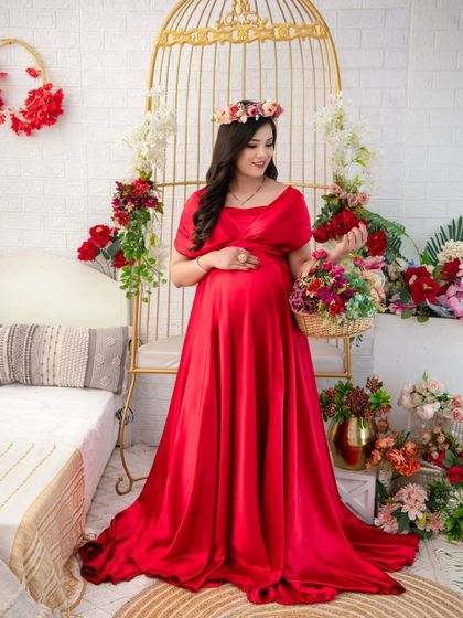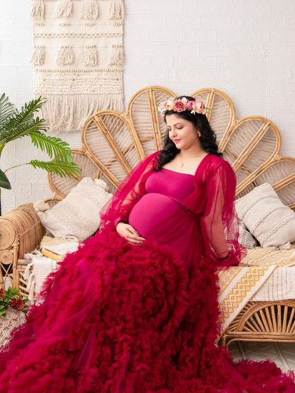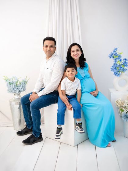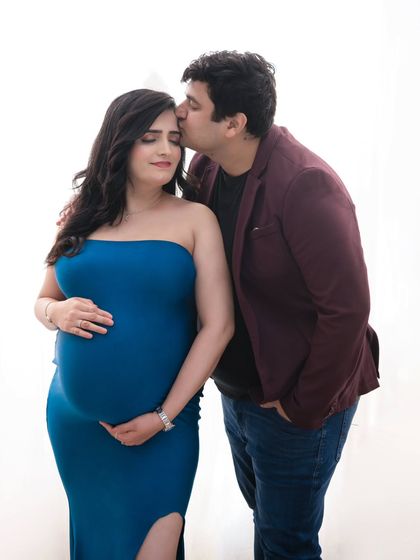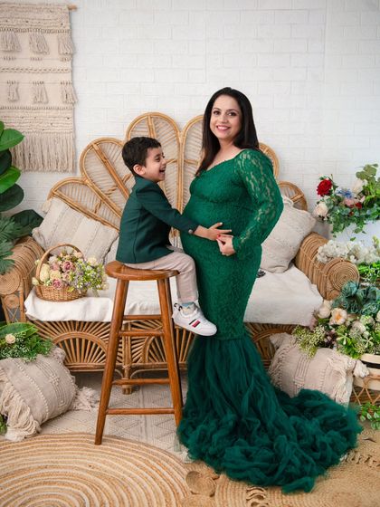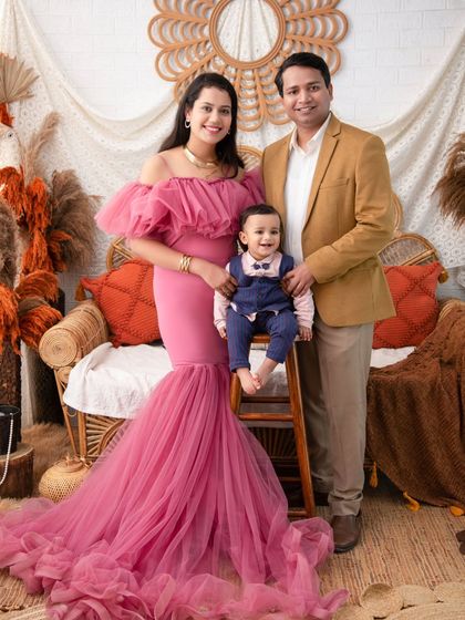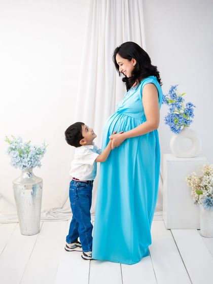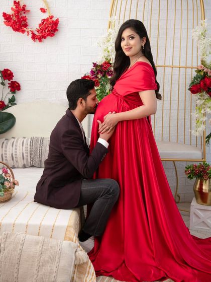 We offer maternity photography in our private Noida studio with multiple set themes, a wardrobe of maternity gowns, and flexible options for solo or family shoots, taking only a few sessions each month for personal attention.
