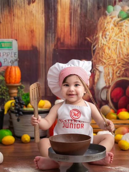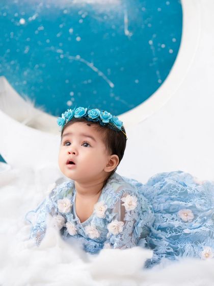 We do themed baby and children photography in our Noida studio with all props, costumes, and setups arranged, and we take only a few shoots each month for personal attention.