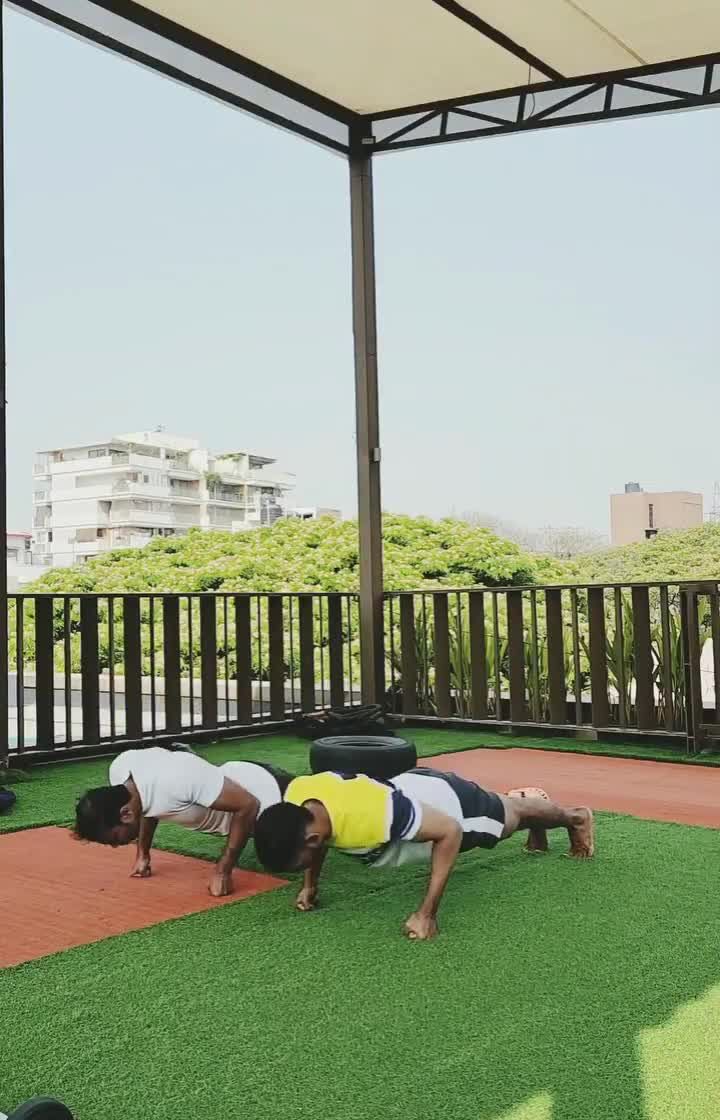Training can be dynamic and interactive. This shows a session combining mobility drills, core work, and boxing basics with a partner, making fitness a collaborative and energetic effort.